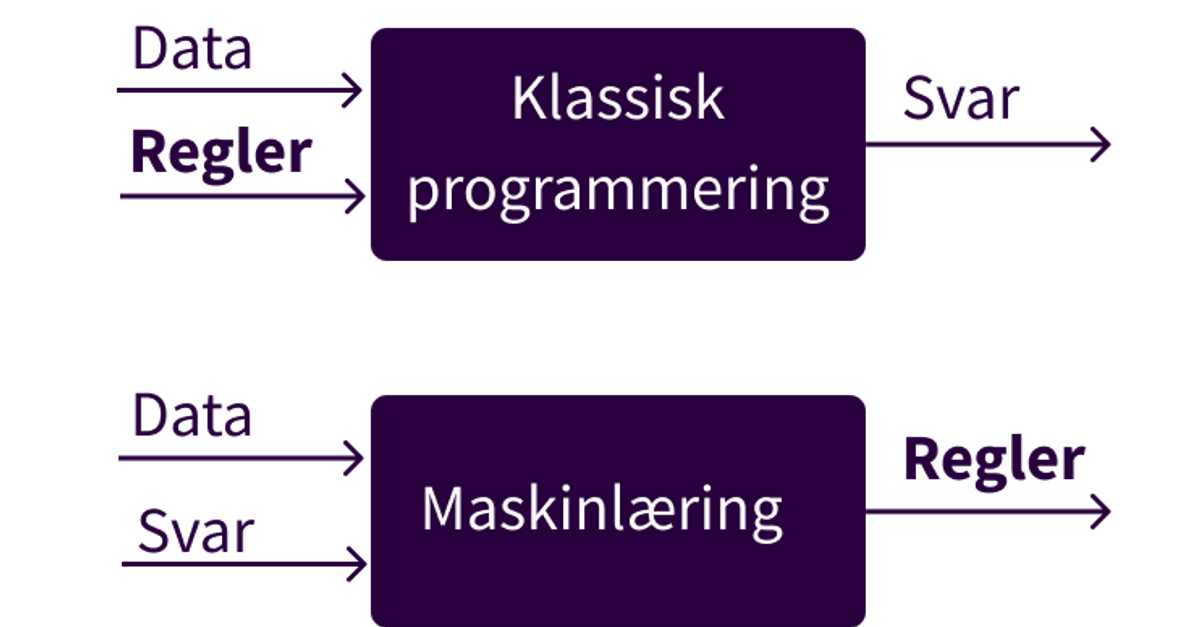 I klassisk programmering er det vi som lager reglene og på den måten styrer hvilke svar vi får.