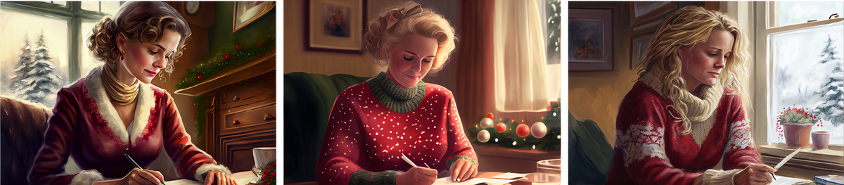 I en travel førjulstid ble det ikke tid til fotoshoot i år. Så bra da, at vi har kunstig intelligens, som lager akkurat det du trenger når du trenger det. Her er noen versjoner av meg som skriver julebrev 💌😄 (laget av Midjourney AI).