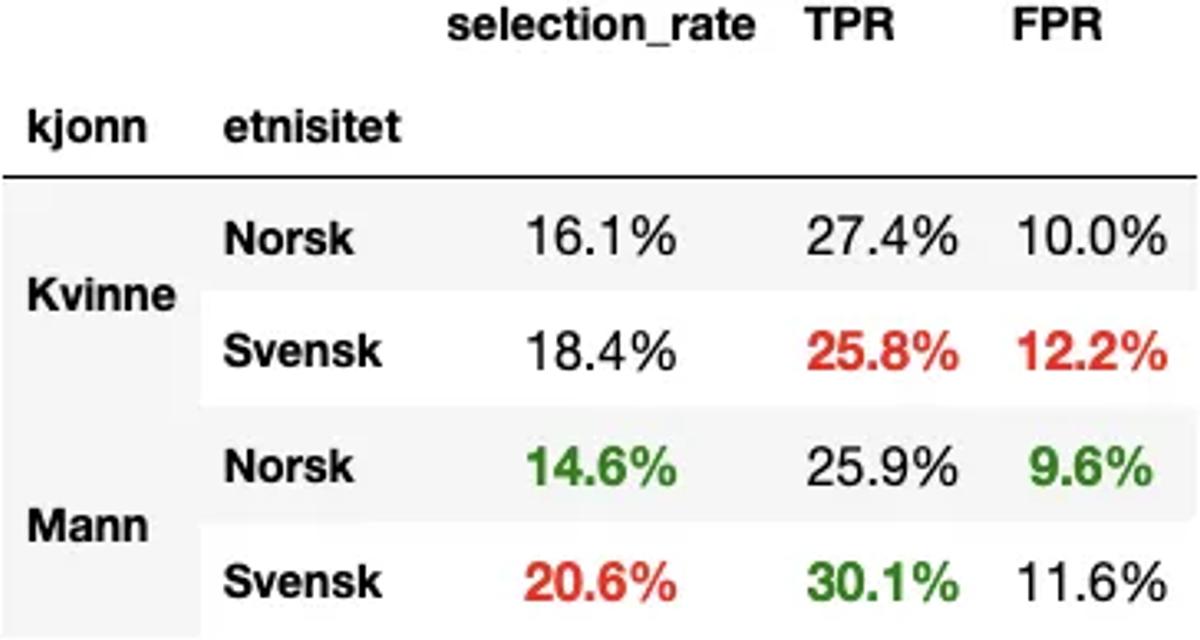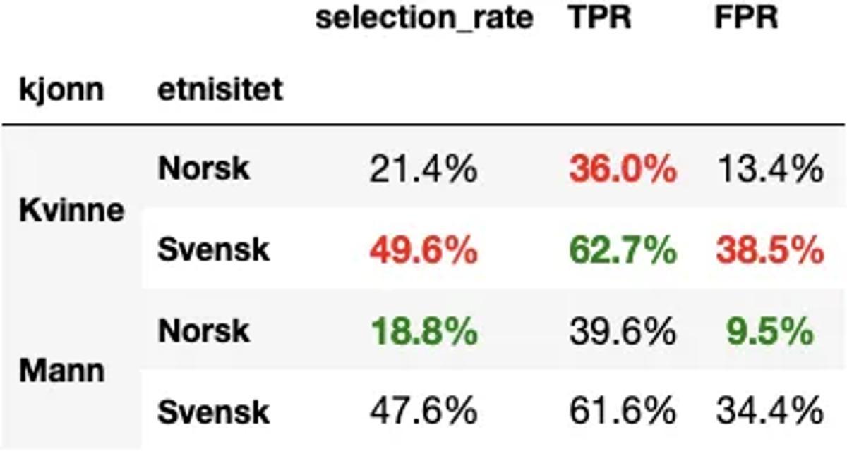 Vi ser at falsk-alarm-raten og sann-positiv-raten nå er mye mer lik på tvers av gruppene. Det er fortsatt forskjell i seleksjonsraten, men det har vi altså godtatt. Så kan en være uenig i om det er greit eller ikke.