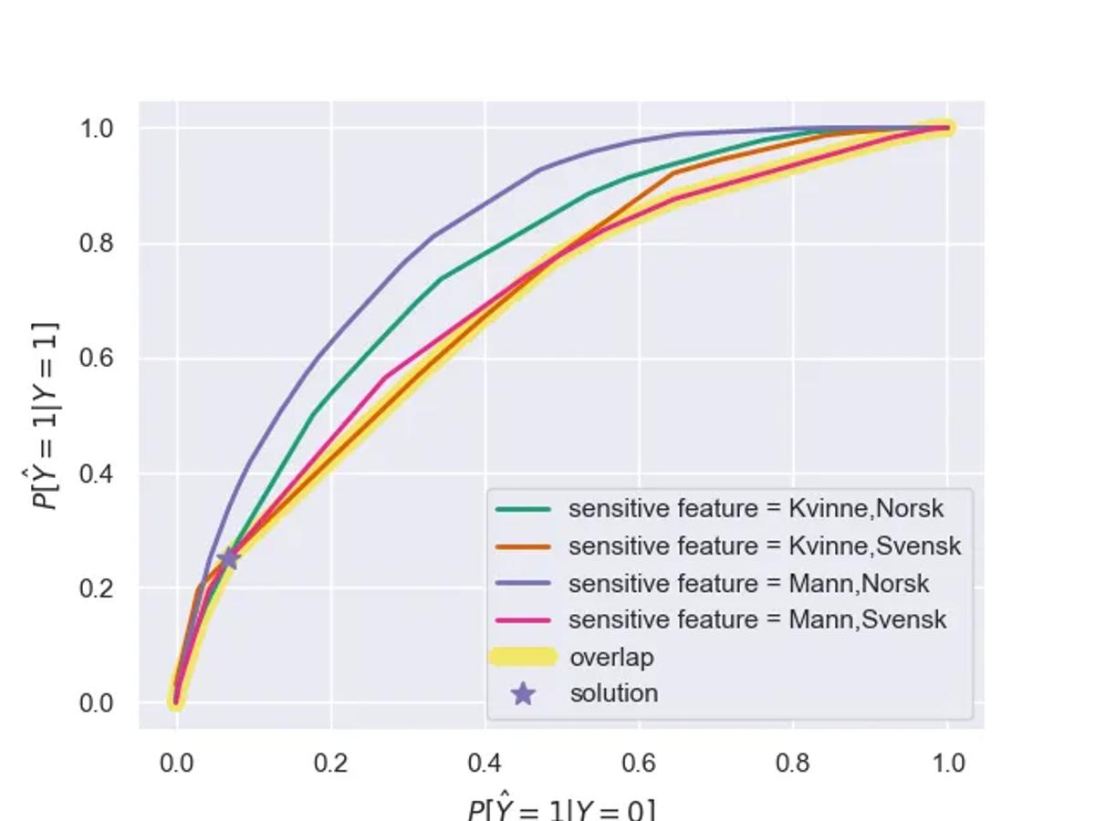 - Utlignet odds: Både sann-positiv-raten og falsk-positiv-raten skal være lik på tvers av alle grupper.