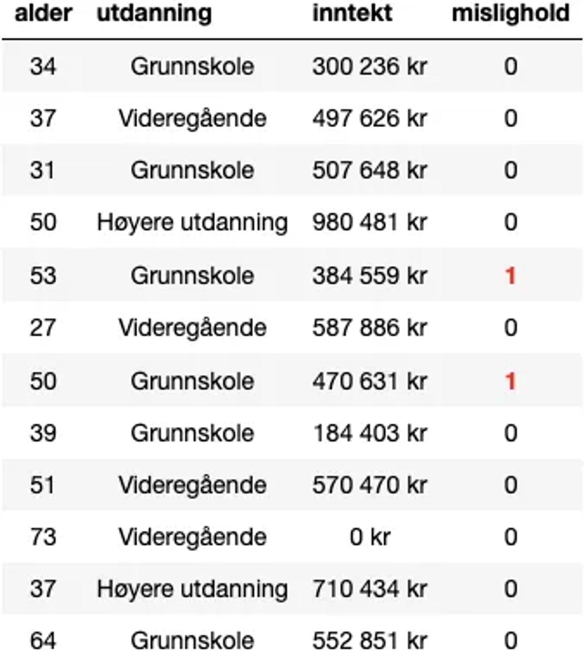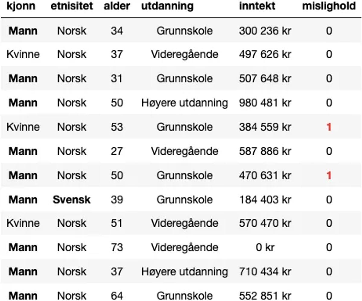 I vårt datasett har vi følgende forklaringsvariabler: Kjønn, etnisitet, alder, utdanning og inntekt. Utfallsvariabelen, mislighold, beskriver hvorvidt vedkommende har misligholdt sine låneforpliktelser. Vi ønsker å gi lån til kunder som ikke vil misligholde sine lån, altså rader der mislighold = 0.