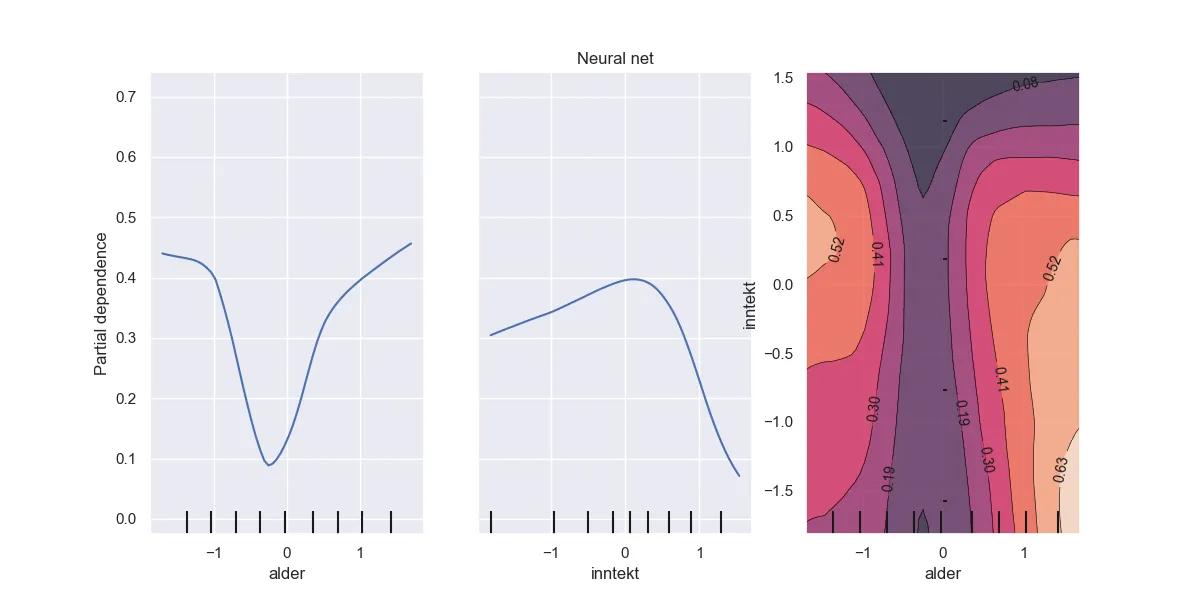 Partielle avhengighetsplott. Generelt gir høyere inntekt lavere estimert sannsynlighet for mislighold. Det samme gjør det å være i midten av livet. Merk at forklaringsvariablene er skalert.