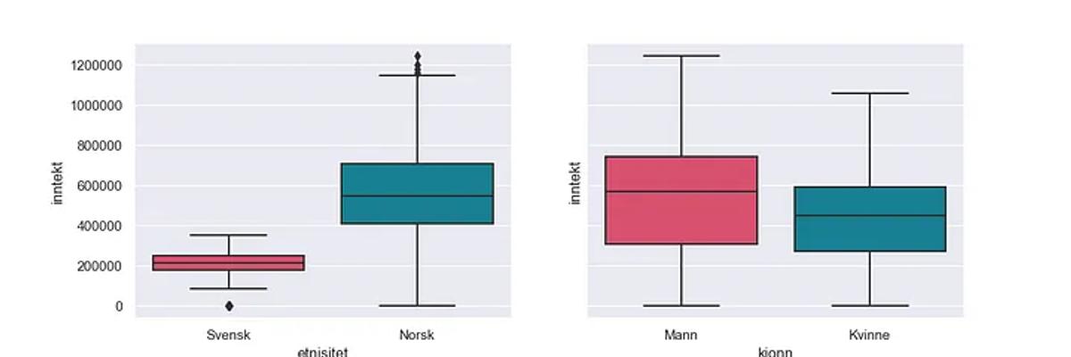 Boksplott for inntekt viser at svensker tjener mindre enn nordmenn, og at menn tjener mer enn kvinner