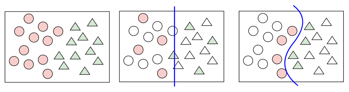 Figur 3: Datasett med 2 klasser (t.v), classifier på random utvalg (midten) og classifier på samples valgt gjennom aktiv læring (t.h)