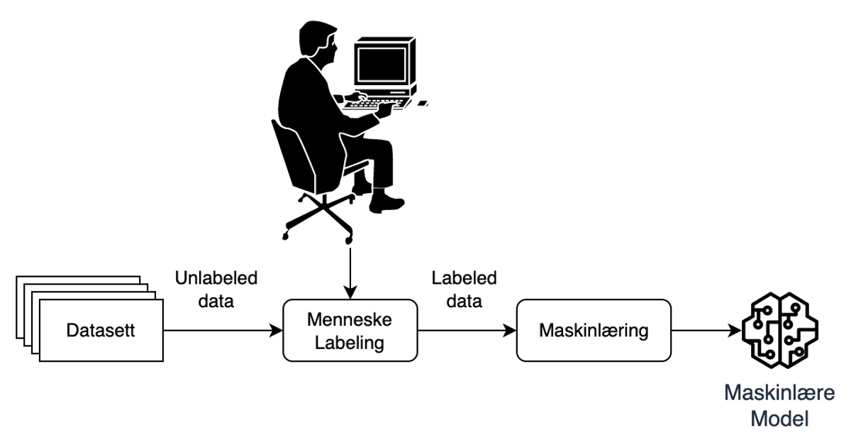 I Figur 1 kan man se en enkel illustrasjon av hvordan en typisk supervised learning-modell blir trent. Først må alle samples i datasettet merkes av mennesker, deretter brukes datasettet til å trene en maskinlæremodell.