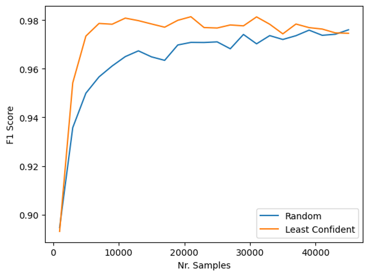 Man kan tydelig se at modellen som bruker tilfeldig utvelgelse av samples trenger mye mer data før den klarer å nå samme nøyaktighet som modellen trent med least confident uncertainty.