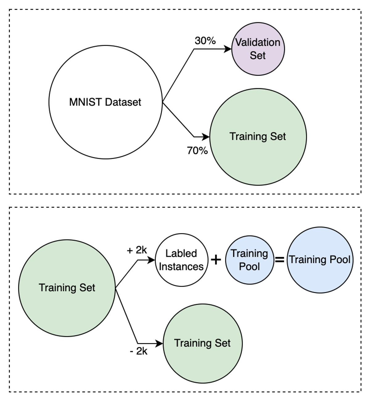 I figuren over kan vi se hvordan det originale MNIST datasettet først er delt opp i et treningssett og et valideringssett med en 70/30 fordeling. Deretter ser vi hvordan vi iterativt henter 2000 samples fra treningssettet, labler dem og legger dem til i trenings-“poolen”. Dette er gjort for å simulere den “aktive” delen av aktiv læring. Maskinlæremodellen vår vil til en hver tid bli trent på den nyeste oppdateringen av treningspoolen.