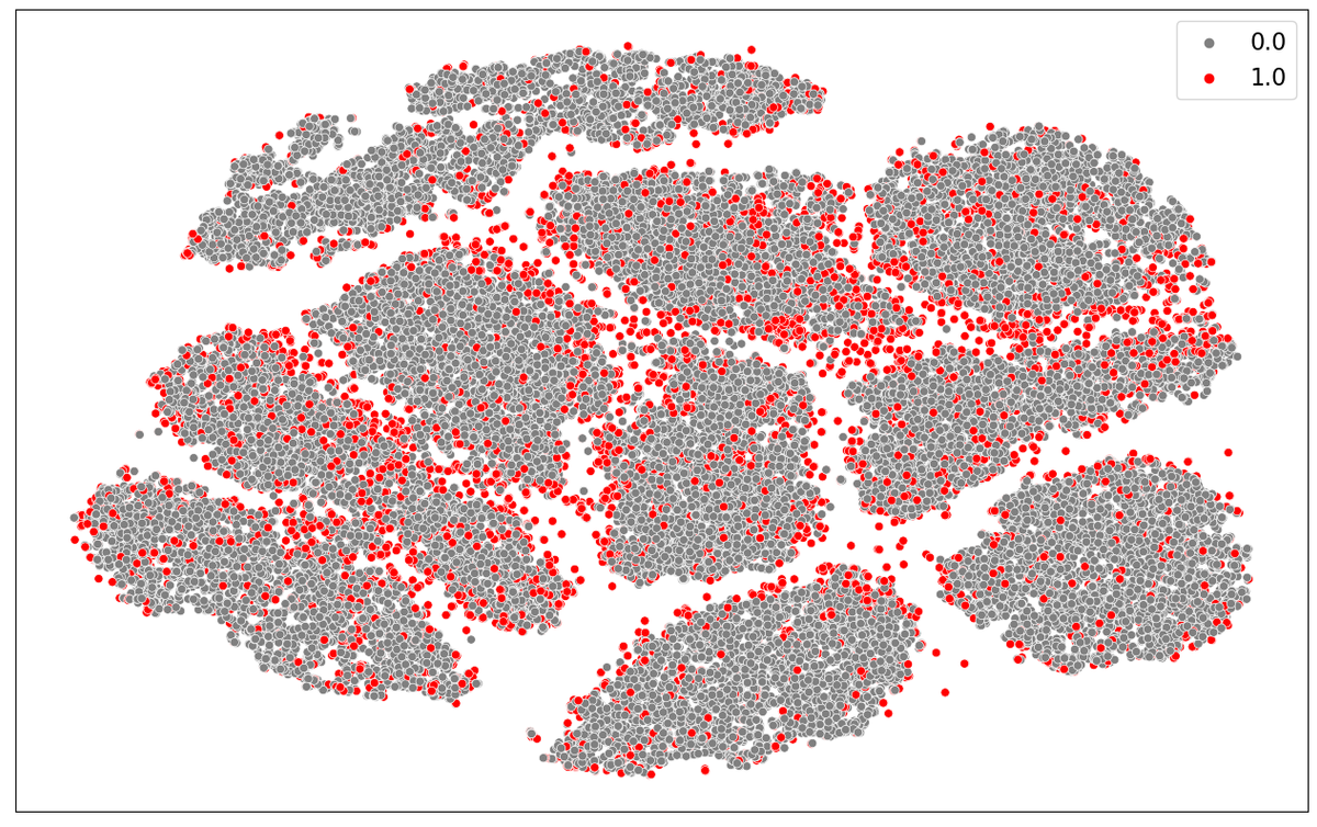 Figur 12: Scatterplot av MNIST, grå sirkler representerer samples i treningssettet, røde representerer samples i treningspoolen (valgt ved å bruke least confidence uncertainty)