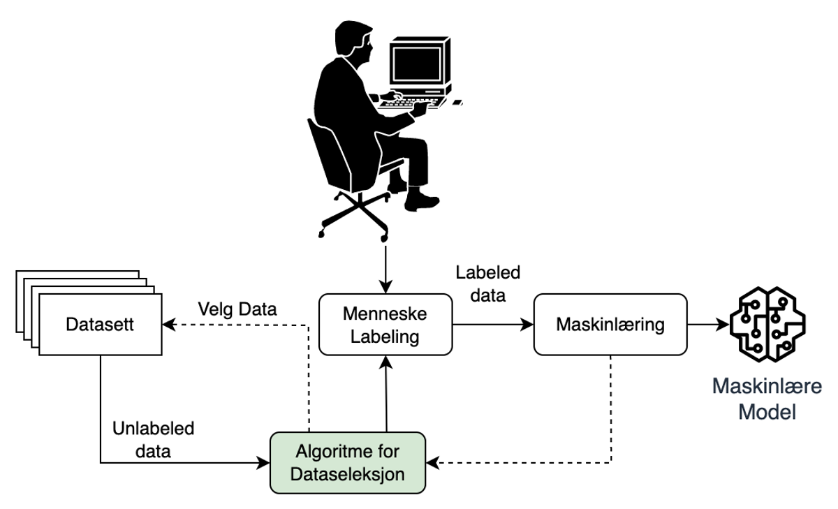 I Figur 2 kan vi se hvordan en modell blir trent under aktiv læring. I motsetning til standard fremgangsmåte (Figur 1), kan vi se at vi nå har lagt til et nytt steg; “Algoritme for Dataseleksjon”. I stedet for at hele datasettet blir merket før treningen starter, skjer dette nå iterativt i løpet av treningsprosessen.