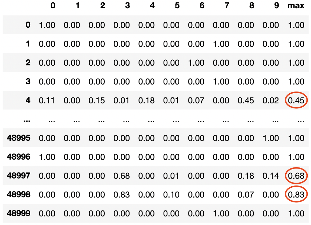 I figuren over ser vi en dataframe med prediksjonene til en modell i kodeeksempelet vårt. Hver rad representerer prediksjonene til modellen for en sample og hver kolonne representerer prediksjonen for en gitt klasse. I figuren over ville de 3 samplene med lavest maksverdi (de som er markert i rødt) vært de mest nyttige for modellen, og det er disse vi burde merke før neste iterasjon av treningsløkken vår.