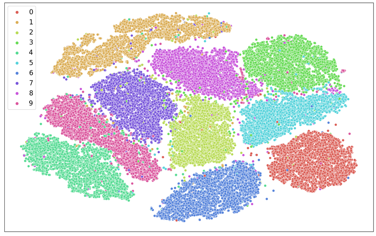 I figuren over kan vi se et scatterplot av MNIST datasettet, etter å ha brukt PCA og t-SNE for å redusere antallet dimensjoner. I figuren tilsvarer hver “prikk” en sample og vi kan se at datasettet har blitt fordelt i ti, roughly, distinkte grupperinger. Dette stemmer godt overens med hva vi forventer med tanke på at datasettet består av 10 klasser, en klasse for hver av tallene fra 0 til 9.