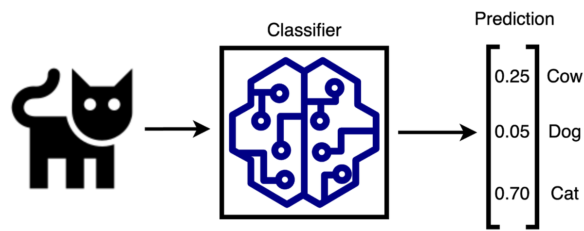 I figuren over ser vi en modell som klassifiserer bilder av dyr samt hvordan outputen fra modellen ser ut. Vi ser at outputen til modellen er en vektor bestående av flyttall, der hvert tall representerer hva modellen tror “sannsynligheten” er for at inputen tilhører de ulike klassene.