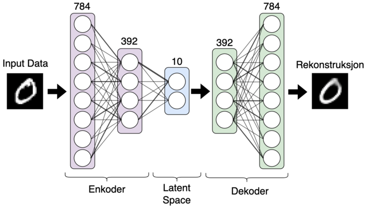Enkoderen er den delen av nettverket som står for å komprimere dataene nettverket tar inn. I Figur 1 kan enkoder sees som de lilla og blå lagene i nettverket. Det ytterste laget i nettverket(helt til venstre) består av 784 nevroner, en nevron pr. pixel i inputdataene. Ettersom vi beveger oss innover i dypet av enkoderen ser vi at det blir færre og færre nevroner pr. lag der vi til slutt ender opp med et lag bestående av kun 10 nevroner. Dette er det siste laget i i enkoderen, og det er her man finner det som ofte kalles the latent representation in latent space. Dette er bare en fancy måte å si nettverkets indre representasjonen av inputdataene. I vårt tilfelle vil outputen fra enkoderen kun bestå av 10 flyttall, en komprimert versjon av bildet det tar inn som består av 784 flyttall.