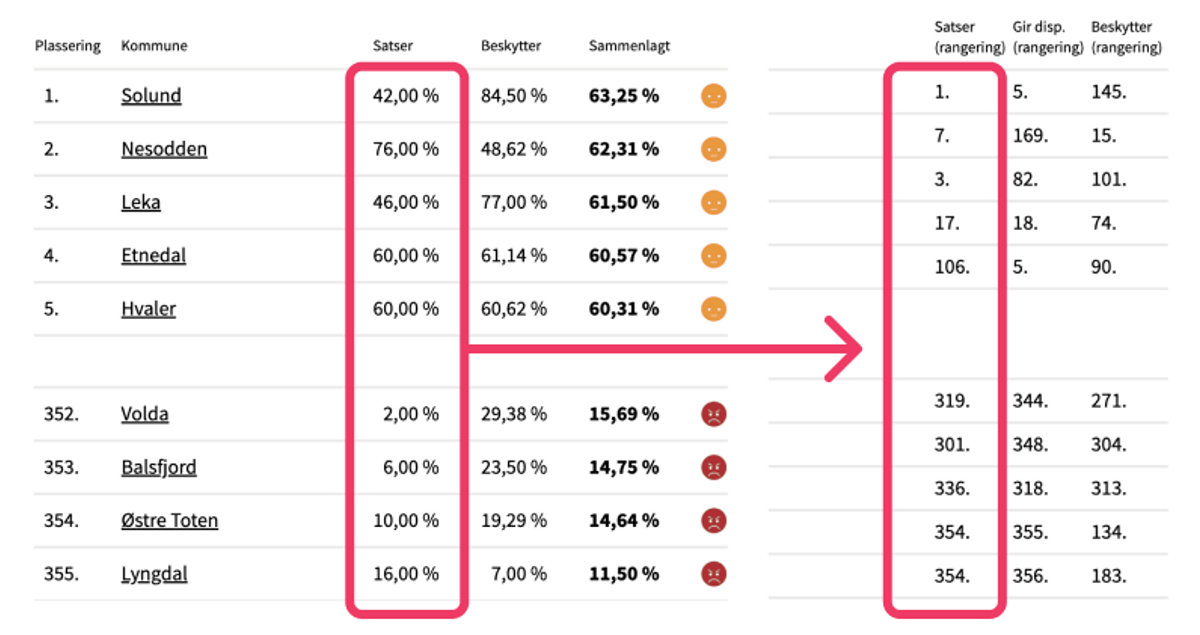 Samtidig er det kanskje noen som spotter en utfordring? Det vil nemlig være en viss sannsynlighet for at to kommuner oppnår akkurat samme Copelandscore, og med det ender uavgjort. Det skjedde så høyt oppe som på 2. plass i årets rangering.