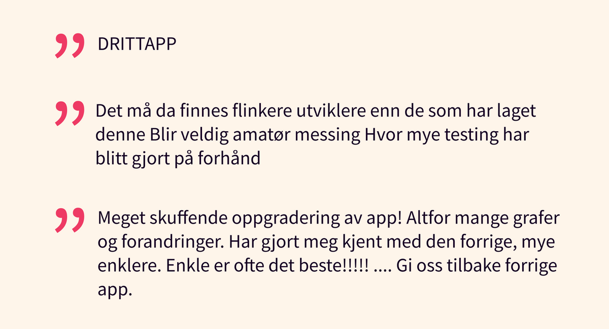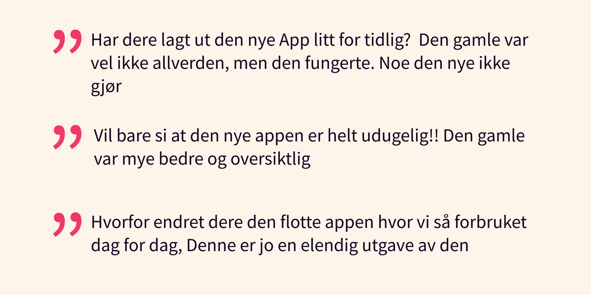 Svært mange av tilbakemeldingene kunne knyttes til denne gruppen og deres skuffelse av å ikke lenger kunne bruke appen som de gjorde før. To uker i forkant av lansering hadde vi sendt ut informasjon til denne gruppen brukere og gitt dem informasjon om at de ville måtte bruke en alternativ webbasert løsning. Ingen tilbakemeldinger på eposten, all sporing tilsa at budskapet var mottatt. Vi har i ettertid erkjent at dette ikke nødvendigvis betyr at budskapet er lest, forstått og godtatt.
